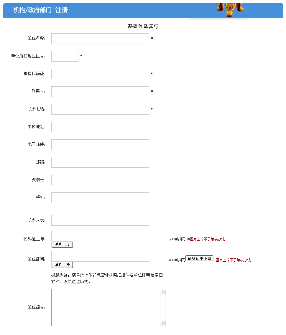 共建单位用户必须为机构或政府部门;用户需在注册页面上传彩色机构代码证扫描件及单位证明盖章扫描件。